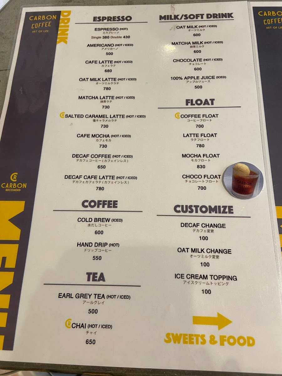 The menu is crafted to delight coffee enthusiasts. Savor their Americano (JP¥500) or indulge in a creamy Café Latte (JP¥680). For something unique, the Matcha Milk (JP¥600) and Salted Caramel (JP¥730) drinks have received rave reviews, particularly the matcha, acclaimed as "the best" by regulars.